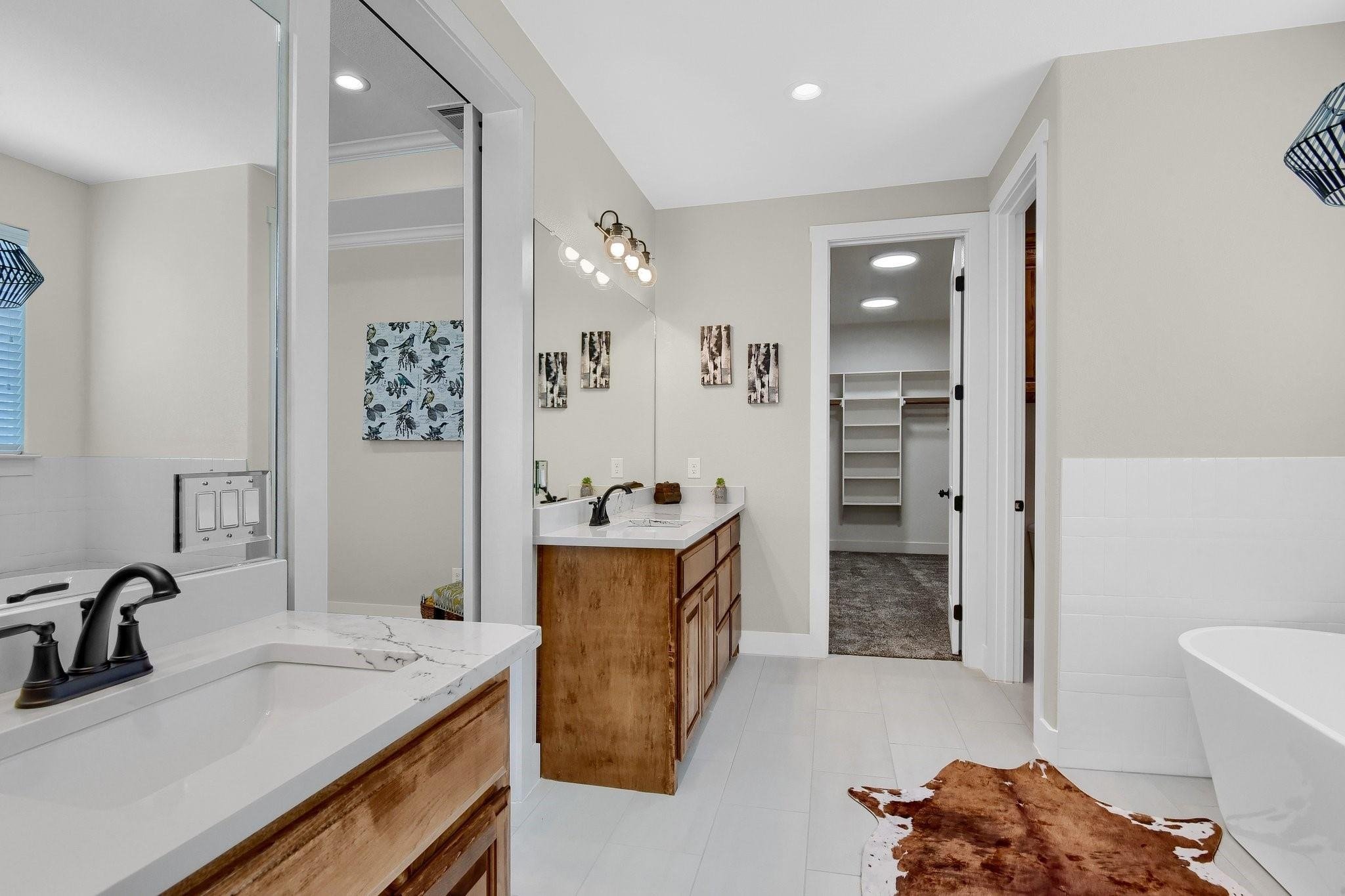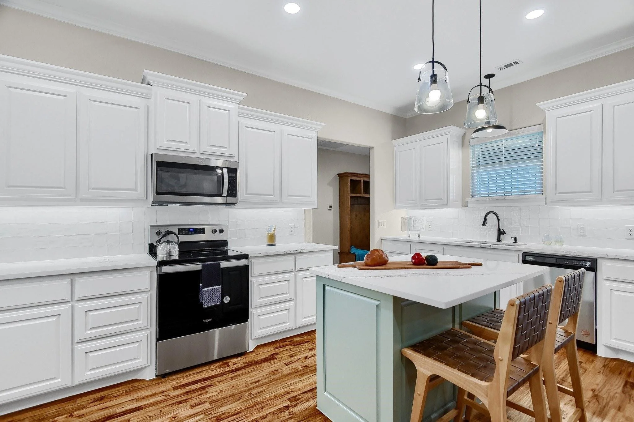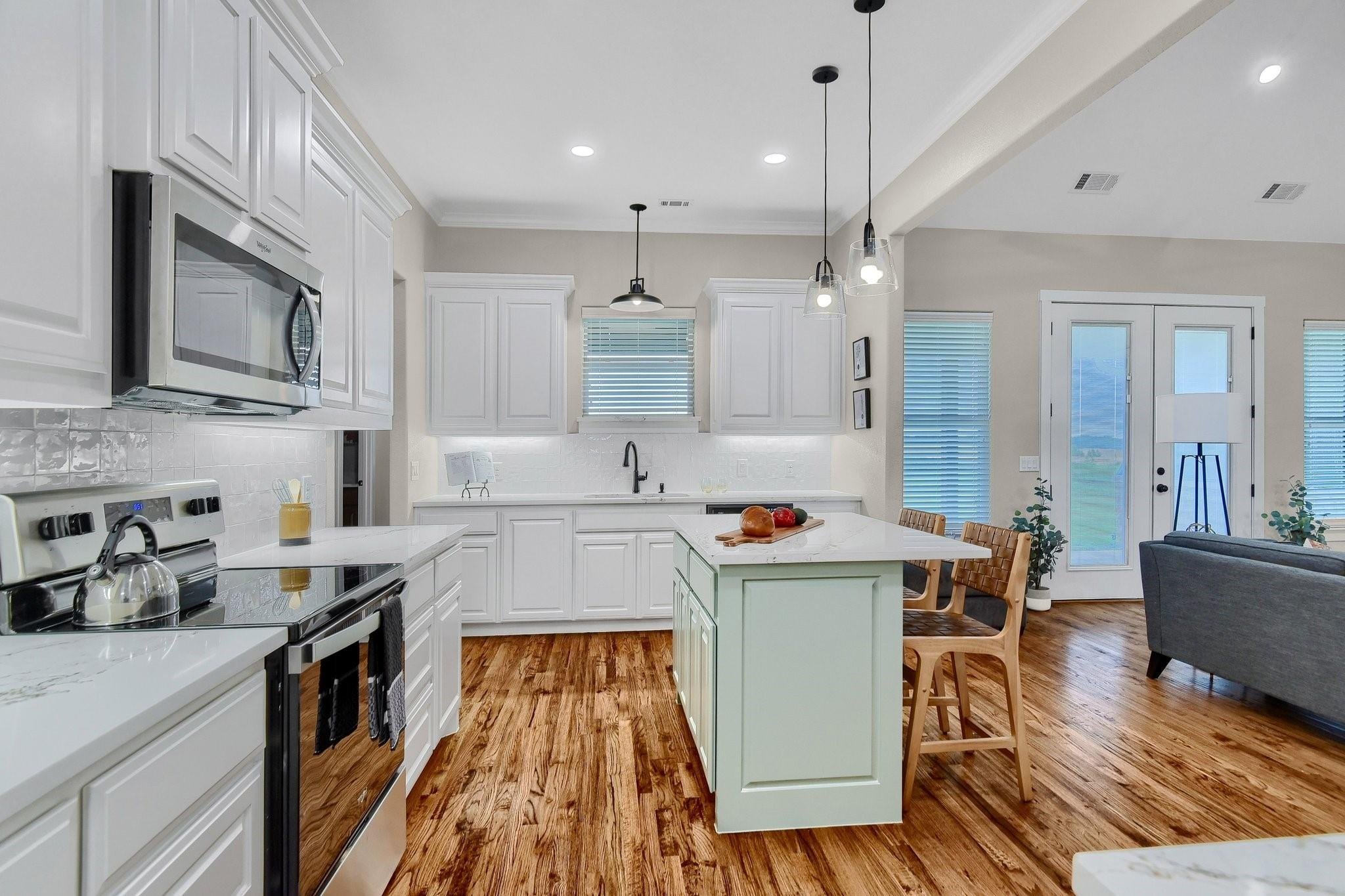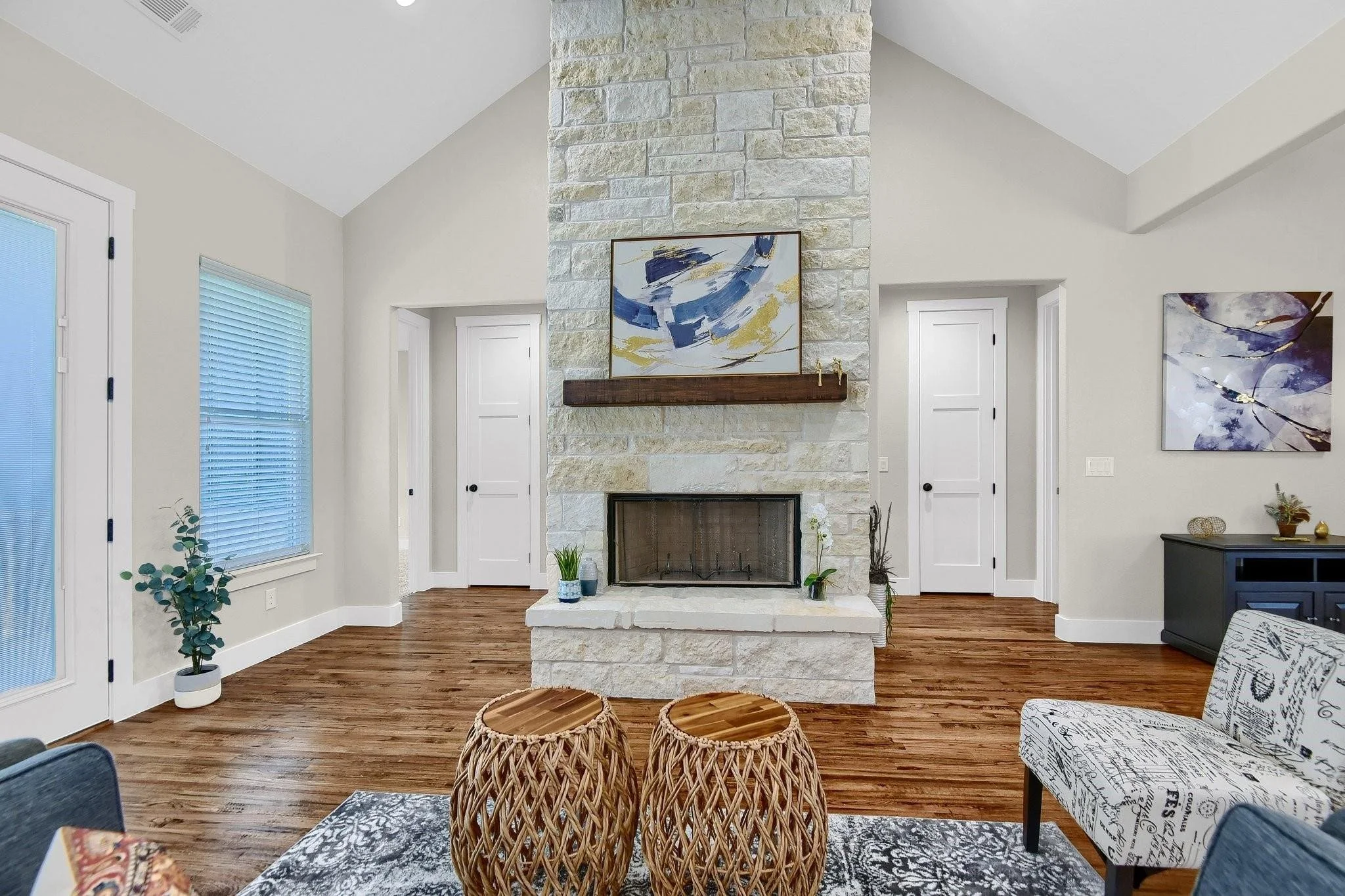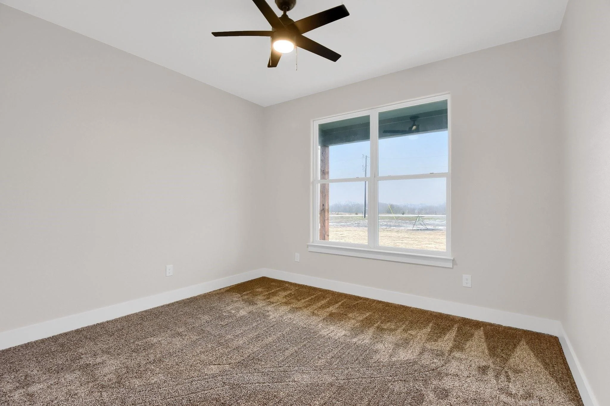 Built in 2023. Country living at its best in this modern Farmhouse new build on 1+ acres. This energy efficient home has spray foam insulation, heat pump, & more. This impressive open concept home has a soaring cathedral ceiling with beam, true 1 1-8 in. hardwood floors, dining area, windows for natural light, & a cozy stone fireplace. The kitchen is a cook's dream with an Island, ample counter space, quartzite countertops, custom cabinets, & a walk in pantry. The master has a spa like en suite with garden tub, walk-in shower, his & hers vanities, & extra large walk in closet with an opening directly into the utility room. Split bedrooms share a full bathroom, & both bedrooms have a large walk in closet. The landscaping has been done & the backyard has a covered porch. The oversize garage has a epoxy finished floor.